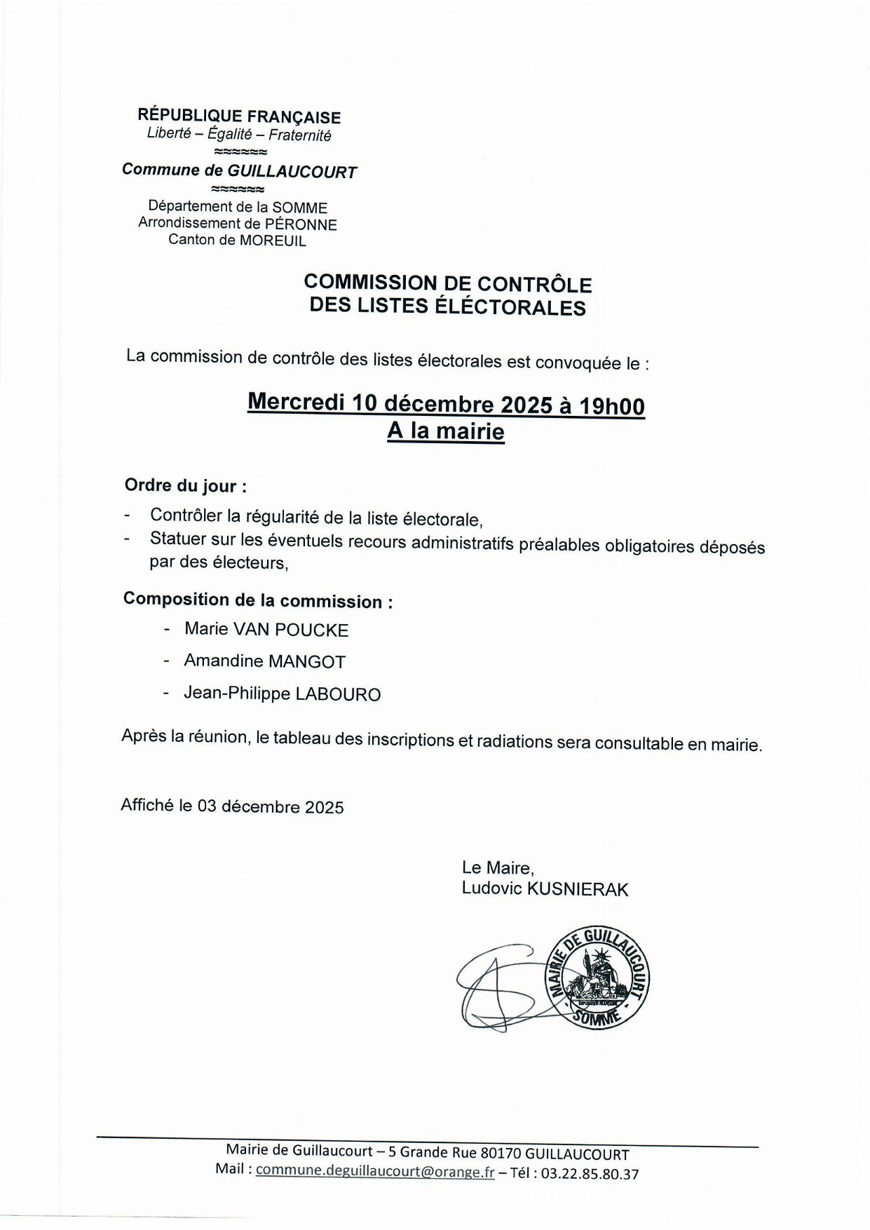 La commission de contrôle des listes électorales se réunira le mercredi 10 décembre 2025 à 19h00 à la mairie.